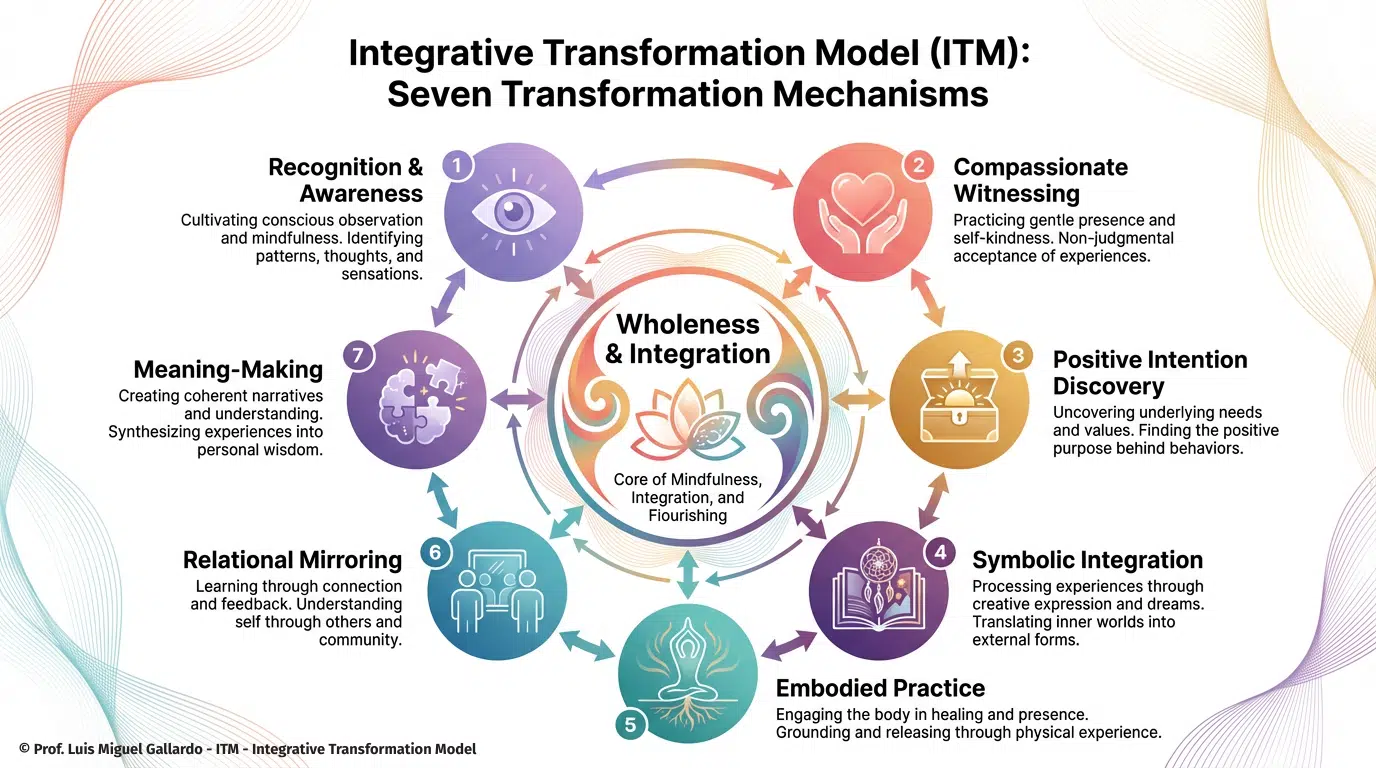 - Seven ITM mechanisms: Recognition/Awareness; Compassionate Witnessing; Positive Intention Discovery; Symbolic Integration; Embodied Practice; Relational Mirroring; Meaning-Making. (Gallardo, 2026a). [47]
